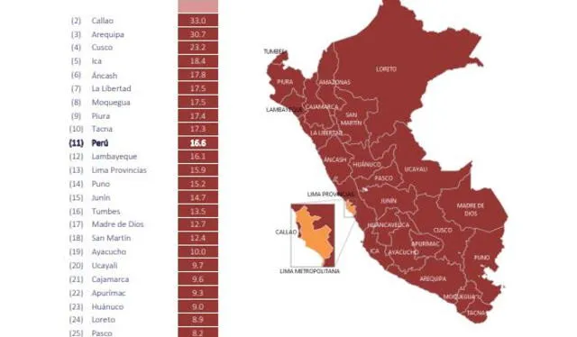 El estancamiento se observa en las regiones, siendo Huancavelica (puesto 27) la que tiene el peor desempeño con 5,3 puntos. No es casualidad que esta región, rezagada en infraestructura desde hace dos lustros, también lidere en pobreza extrema.