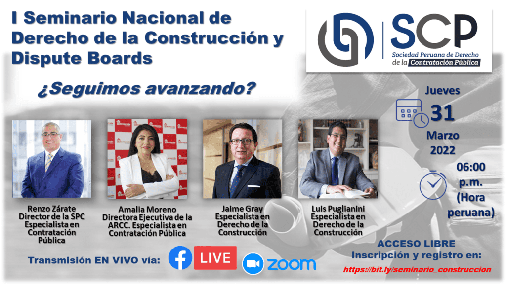 Como parte de su programación académica, la Sociedad Peruana de Derecho de la Contratación Pública – SCP invita a todos sus miembros, seguidores y público en general al Primer Seminario Nacional de Derecho de la Construcción y Dispute Boards – ¿Seguimos avanzando?, a llevarse a cabo este jueves 31 de marzo a las 6:00 p. m.